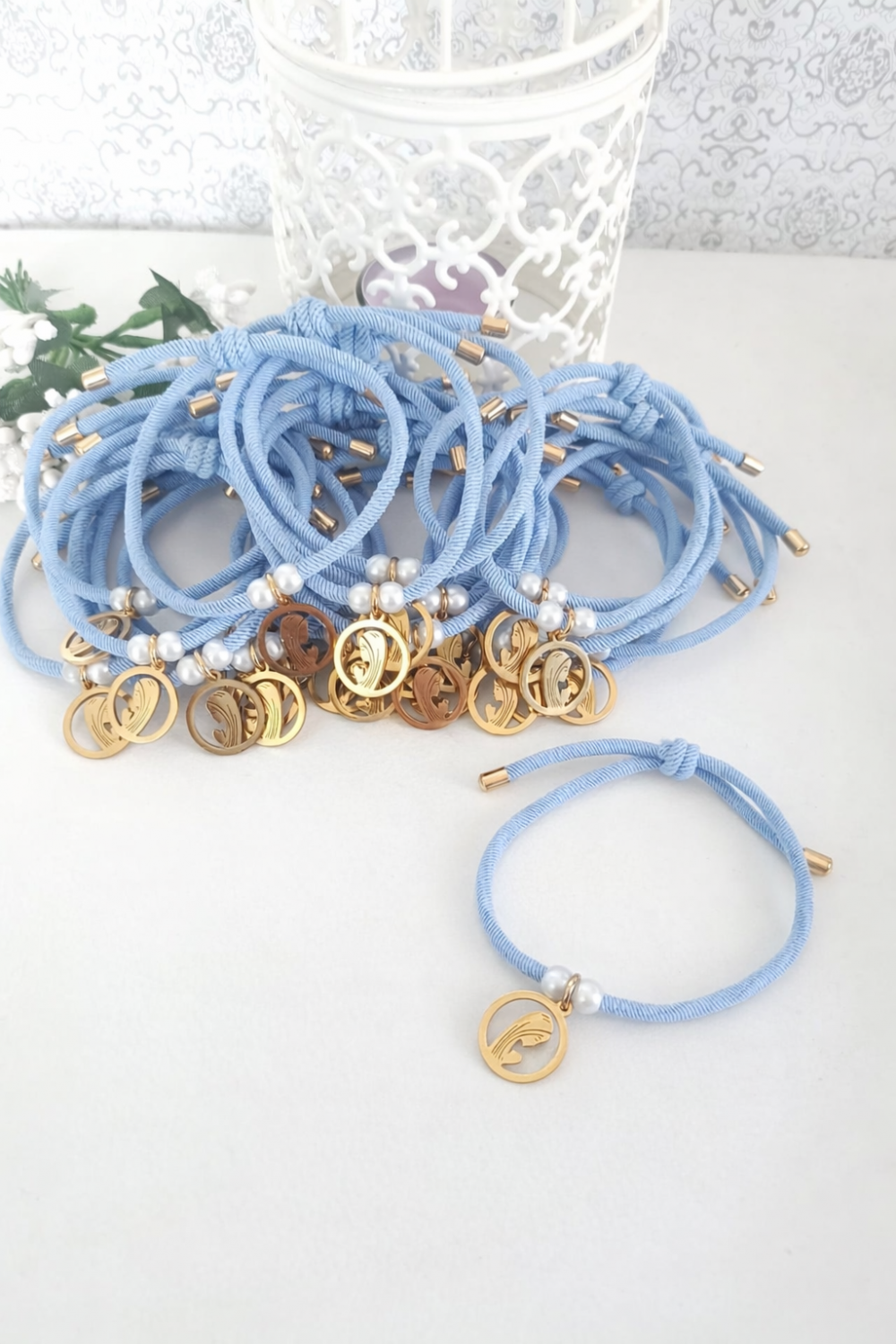 50 unid. Pulsera elástica ajustable con colgante virgencita y terminales en acero inoxidable. (Plazo 10 días)