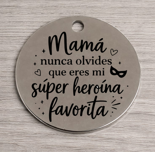Colgante acero inoxidable 30mm. Agujero 2 - 2,5mm. Mamá nunca olvides que eres mi súper heroína