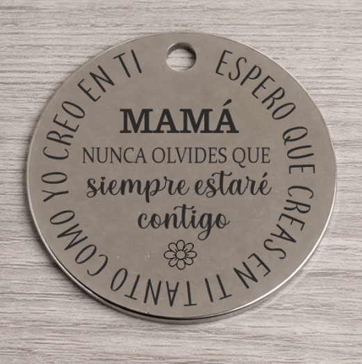 Colgante acero inoxidable 30mm. Agujero 2 - 2,5mm. Mamá estamos hechos de pedacitos de ti